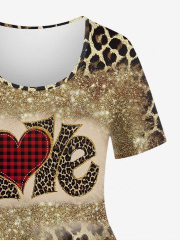 T-shirt Brillant 3D Léopard Cœur Imprimé à Carreaux de Grande Taille - Café - Café