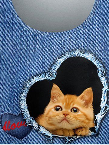 T-Shirts Graphiques > T-shirt Déchiré 3D Chat Imprimé de Grande Taille en Denim
