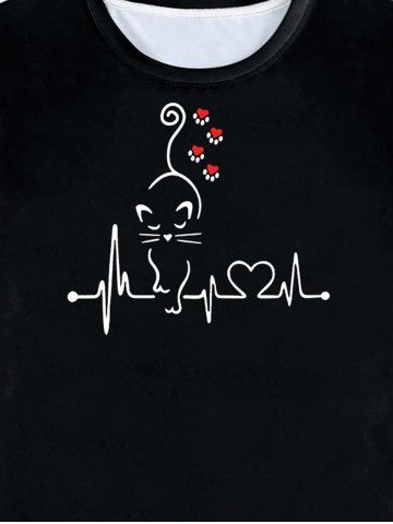 T-shirt Unisexe Graphique à Imprimé Chat et ECG - Noir - Noir