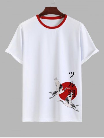T-shirt Graphique Géométrique Grue Fleur de Pêcher Imprimé à Manches Courtes pour Homme - Blanc - Blanc