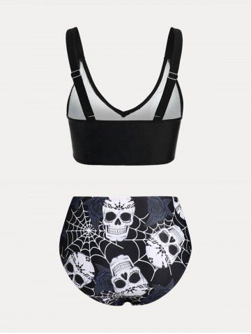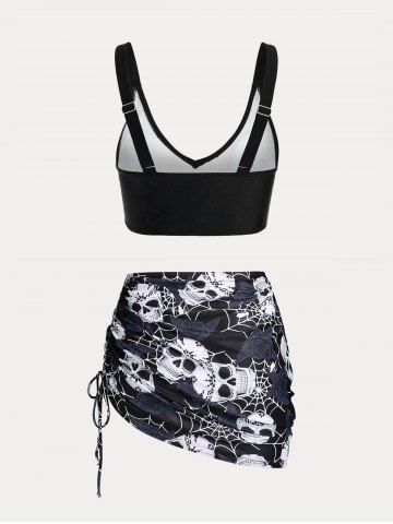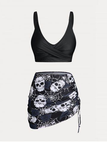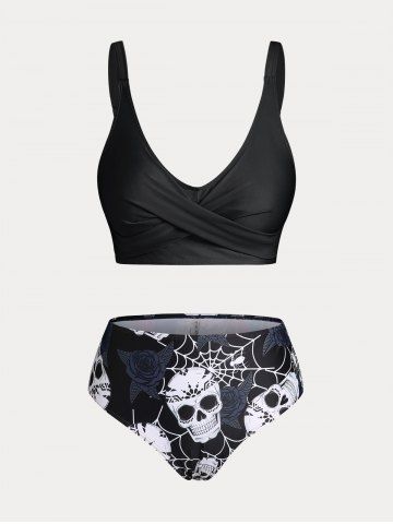 Maillot de Bain Bikini Croisé Rose et Crâne Imprimés de Grande Taille Trois Pièces - Noir - Noir