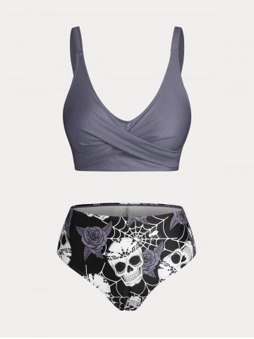 Maillot de bain bikini trois pièces croisé à imprimé tête de mort et rose, grandes tailles et formes généreuses. - Gris - Gris