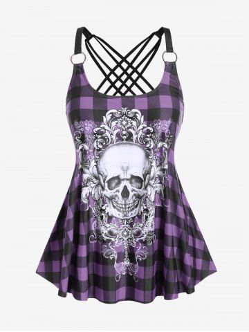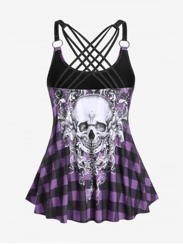 Maillot de bain tankini à carreaux gothiques et têtes de mort, rembourré, shorty, bretelles, modeste, style bouffant. - Pourpre - Pourpre