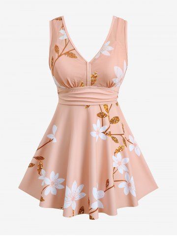 Tankinis > Maillot de bain tankini grande taille à imprimé fleurs, feuilles et branches, coupe shorty
