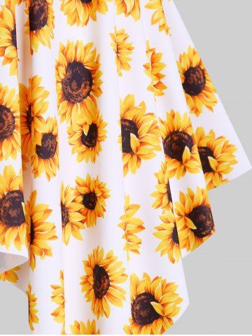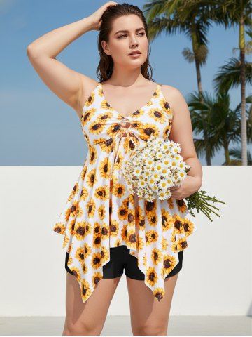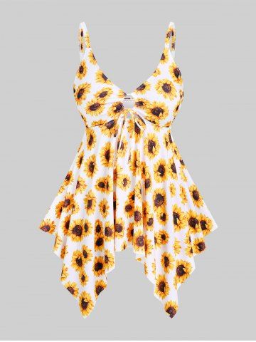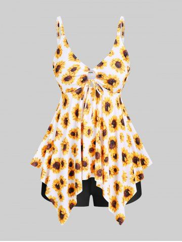 Tankinis > Maillot de Bain Tankini Mouchoir Courbe Sanglé à Imprimé Tournesol de Grande Taille à Volants