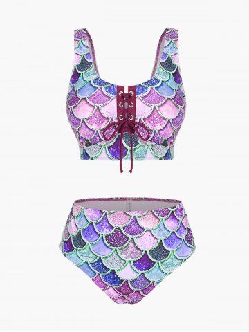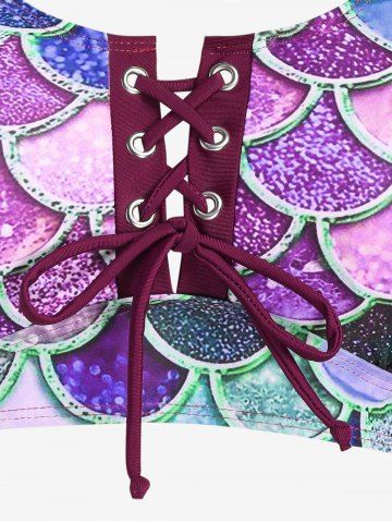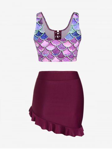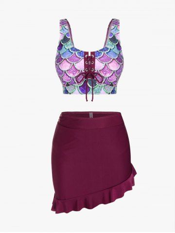 j*****e5Mermaid Print Lace Up Three Piece Tankini SwimsuitColor: PURPLE Size: 1X | US 14-16This suit is great for a curvy girl. It fits corectly. The skirt is snug but can be worn right into the water. The mermaid design is fun and colourful. The laced up front lets you adjust the cleavage coverage. Perfect for a trip south.