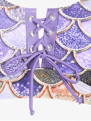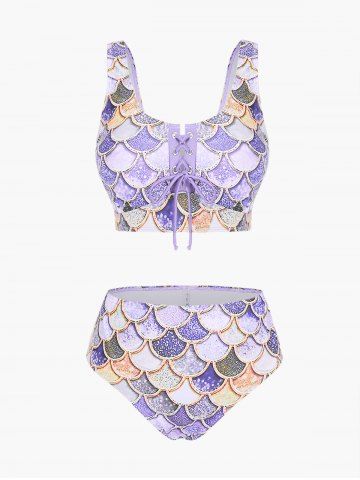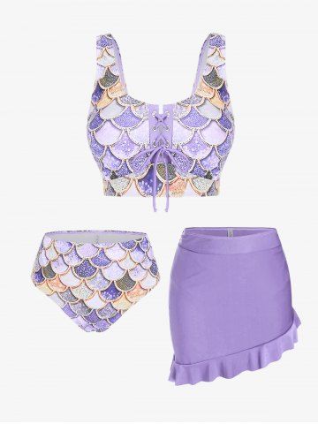 j*****e5Mermaid Print Lace Up Three Piece Tankini SwimsuitColor: PURPLE Size: 1X | US 14-16This suit is great for a curvy girl. It fits corectly. The skirt is snug but can be worn right into the water. The mermaid design is fun and colourful. The laced up front lets you adjust the cleavage coverage. Perfect for a trip south.