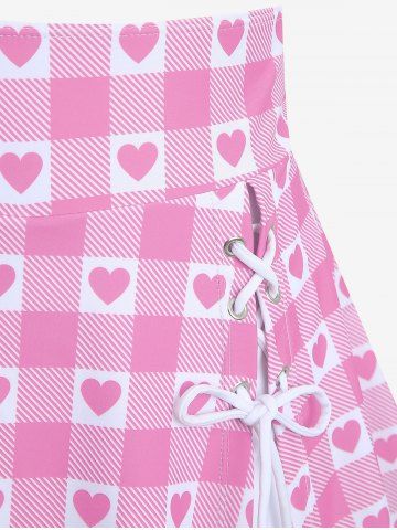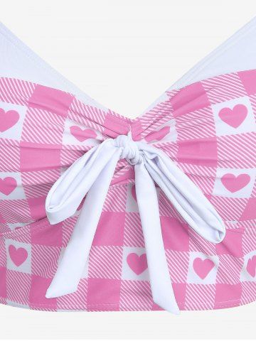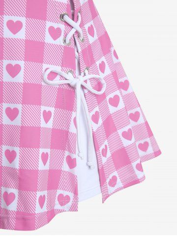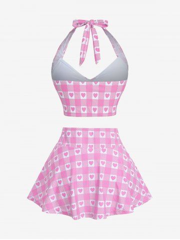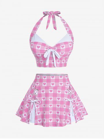 Plus Size Plaid Heart Print Halter Bowknot Lace Up Skirted Tankini Swimsuit - Rose - Rose