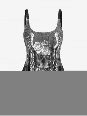 Plus Size Skull Rose Wing Print Cinched Boyshorts Tankini Swimsuit - Gris - Gris