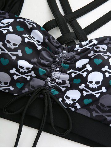 Tankinis > Plus Size Skulls Heart Print Crisscross Cinched Ruffles Asymmetrical Skirt Tankini Swimsuit