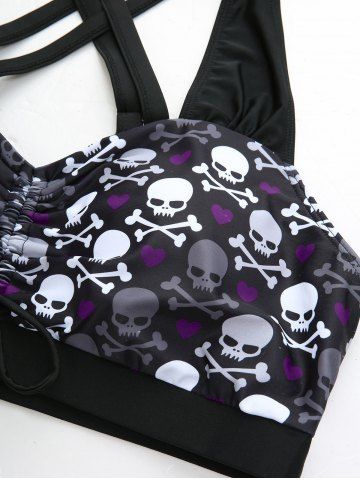 Tankinis > Plus Size Skulls Heart Print Crisscross Cinched Ruffles Asymmetrical Skirt Tankini Swimsuit