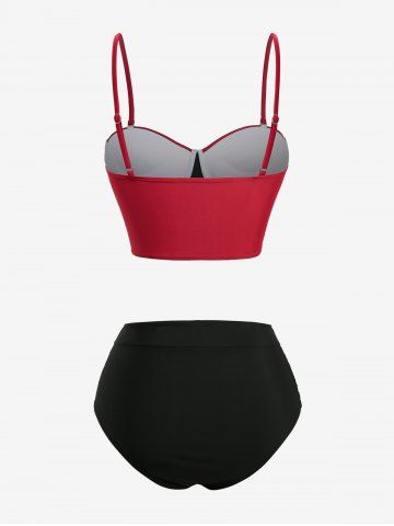 Lace Up Bowknot Tie Ruched Buttons Bottom Tankini Swimsuit - Rouge - Rouge