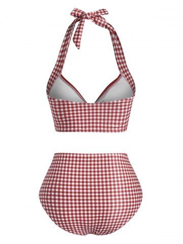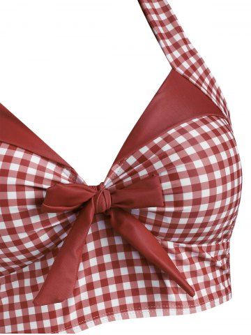 Maillot de Bain Tankini Embelli de Bouton et de Nœud Papillon en Vichy à Col Halter - Rouge - Rouge