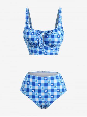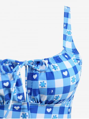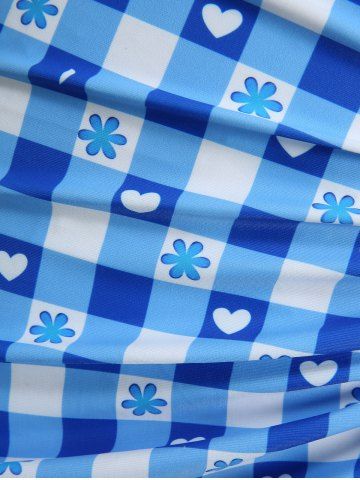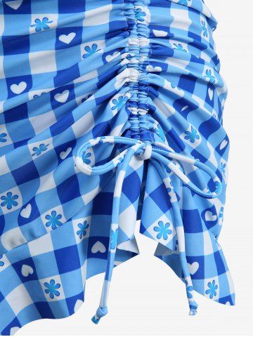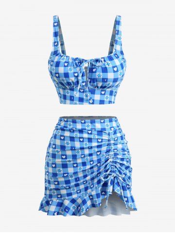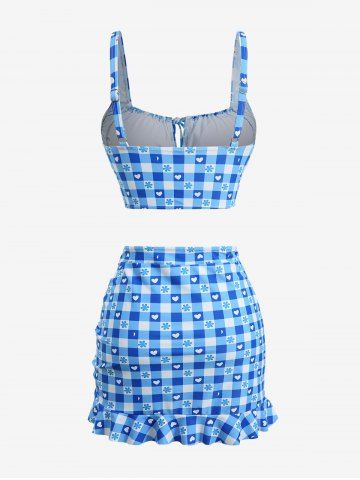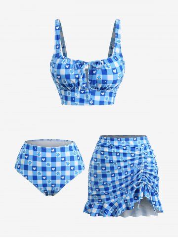 Plaid Flower Heart Print Cinched Ruffles Skirt Three Piece Tankini Swimsuit - Bleu Ciel - Bleu Ciel