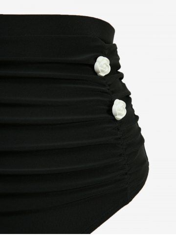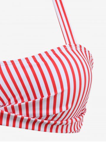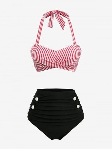 Striped Print Crossover Halter Ruched Button Tankini Swimsuit - Noir - Noir