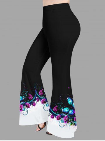 Pantalon évasé grande taille à imprimé roses et papillons - Noir - Noir