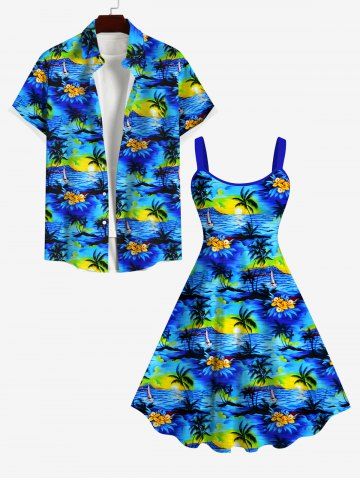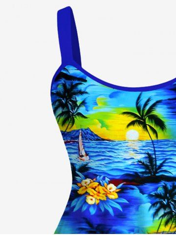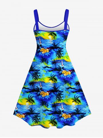Robe Pin-Up Imprimée Cocotier Floral Grande Taille à Dos Nu - Bleu - Bleu