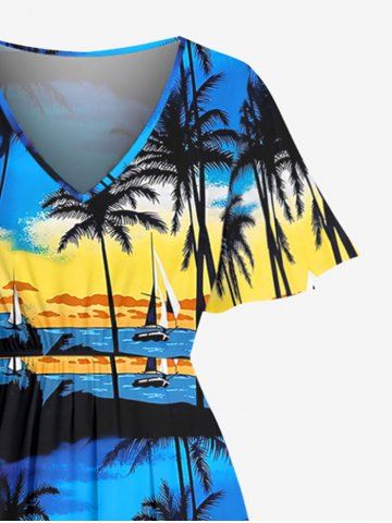 Robe midi fendue hawaïenne à imprimé de cocotiers et de voiliers, grande taille - Bleu Profond - Xs
