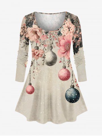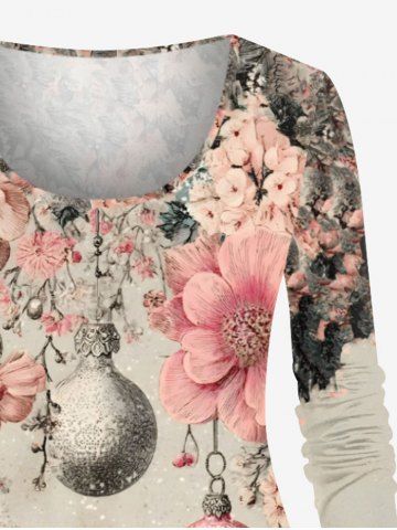 T-shirt à manches longues grande taille avec imprimé de boules de Noël et de fleurs - Abricot - Abricot