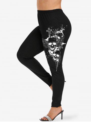 Ensemble T-shirt et legging grande taille à imprimé éclaboussures de peinture avec têtes de mort, ailes et croix - Noir - Noir