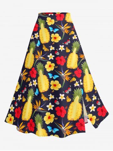 Tenues Graphiques > Solid Cinched Top and Pineapple Hibiscus Flower Butterfly Print Hawaii Split A Line Skirt Plus Size Matching Set