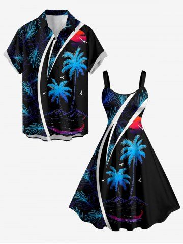 Coconut Tree Tropical Leaf Sun Sea Waves Print Plus Size Matching Hawaii Beach Outfit For Couples - Noir - Noir