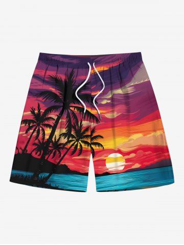 Contrastant Imprimé Cocotier et Coucher du Soleil Derrière la Plage Grande Taille pour Couples - Rouge - Rouge