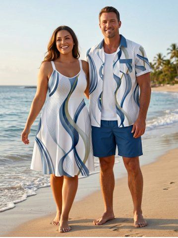 Curve Ligh Beam Print Plus Size Matching Hawaii Beach Outfit For Couples - Bleu-gris