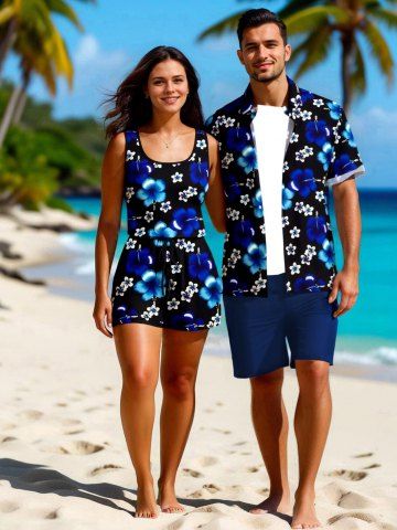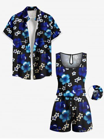 Tenues Hawaïennes Assorties> Ensemble chemise hawaïenne et barboteuse grande taille, tenue de plage assortie, imprimé fleurs d'hibiscus ombré, pour couples