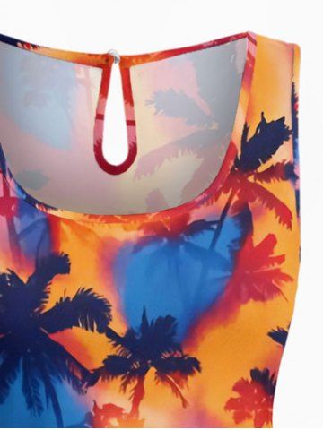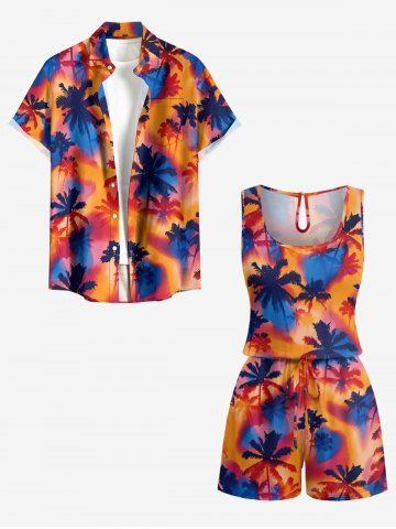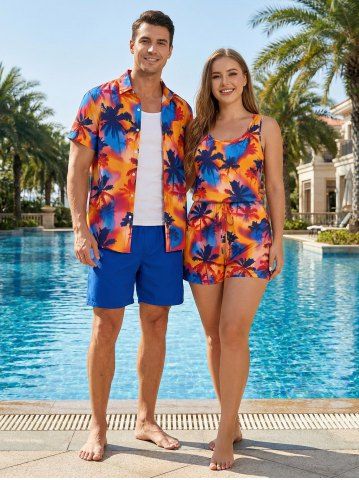 Tenues Hawaïennes Assorties> Ensemble de plage assorti chemise hawaïenne et barboteuse grande taille, imprimé tie-dye cocotier pour couples