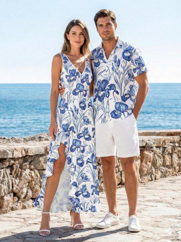 Tenues Hawaïennes Assorties> Ensemble de plage hawaïen assorti grande taille à imprimé fleurs d'iris pour couples