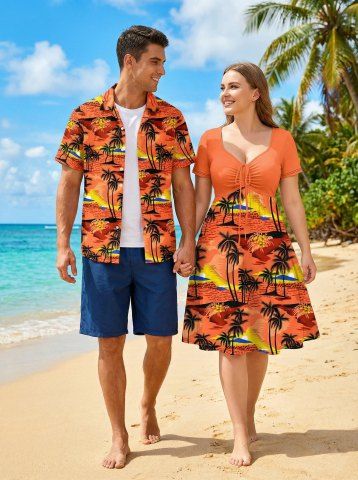 Tenues Hawaïennes Assorties> Ensemble de plage hawaïen assorti grande taille à imprimé fleurs de cocotier pour couples