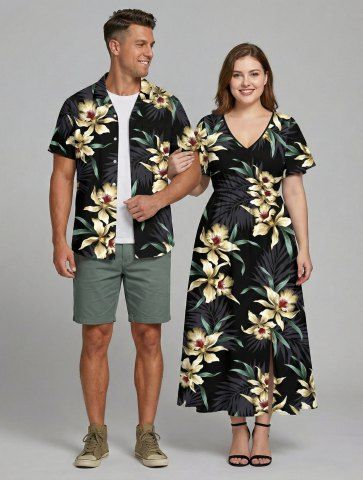 Tenues Hawaïennes Assorties> Ensemble de plage hawaïen assorti grande taille à imprimé fleurs et feuilles pour couples
