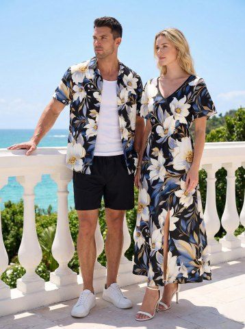 Tenues Hawaïennes Assorties> Ensemble de plage hawaïen assorti grande taille à imprimé fleurs et feuilles pour couples