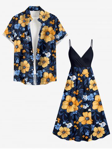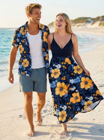 Tenues Hawaïennes Assorties> Ensemble de plage hawaïen assorti grande taille à imprimé fleurs et feuilles pour couples