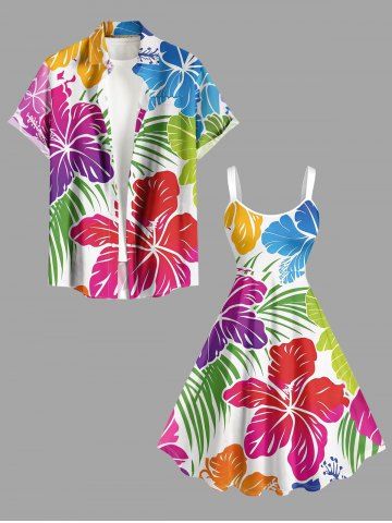 Ensemble de plage hawaïen assorti grande taille à imprimé floral d'hibiscus tropical pour couples - Blanc - Blanc