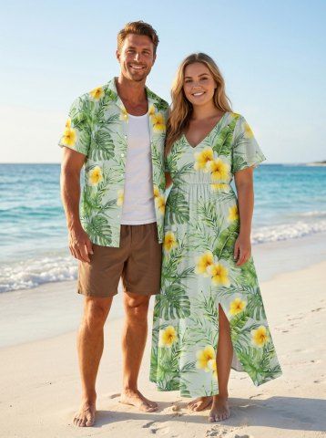 Ensemble de plage hawaïen assorti grande taille à imprimé floral d'hibiscus tropical pour couples - Vert - Vert