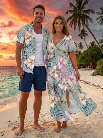 Tenues Hawaïennes Assorties> Ensemble de plage hawaïen assorti grande taille à imprimé floral tropical pour couples