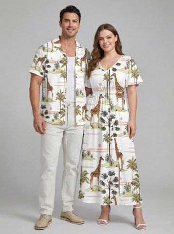 Tenues Hawaïennes Assorties> Ensemble de plage hawaïen assorti grande taille à imprimé girafe, cocotier et soleil pour couples