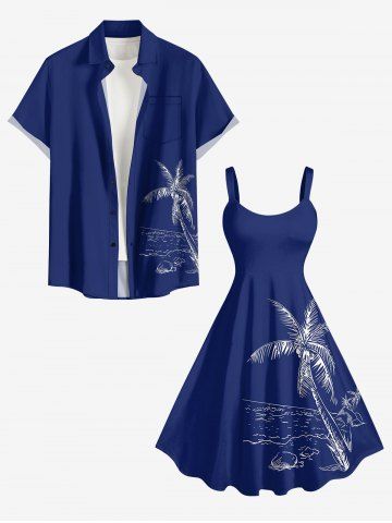 Tenues Hawaïennes Assorties> Ensemble de plage hawaïen assorti grande taille à imprimé paysage marin et cocotiers pour couples