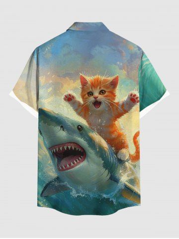 Tenues Hawaïennes Assorties > Ensemble de plage hawaïen assorti grande taille à imprimé requin et chat et vagues pour couples