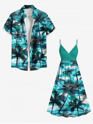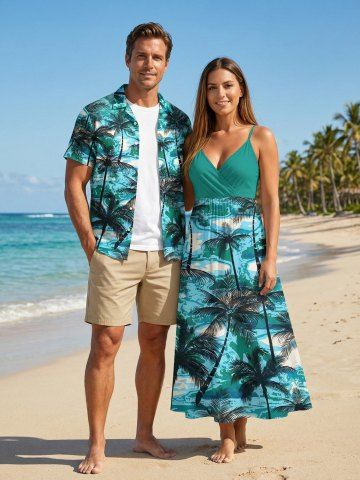 Tenues Hawaïennes Assorties> Ensemble de plage hawaïen assorti grande taille imprimé cocotiers et vagues pour couples