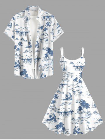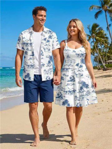 Ensemble de plage hawaïen assorti grande taille, motif voilier et cocotier, pour couples - Blanc - Blanc