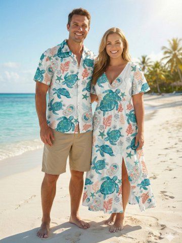 Tenues Hawaïennes Assorties> Ensemble de plage hawaïen assorti grande taille pour couples, imprimé tortue, cachemire, fleurs, feuilles et étoiles de mer