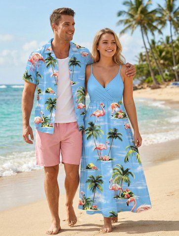 Tenues Hawaïennes Assorties> Ensemble de plage hawaïen assorti grande taille pour couples, motif cocotier, flamant rose et hibiscus, imprimé marin
