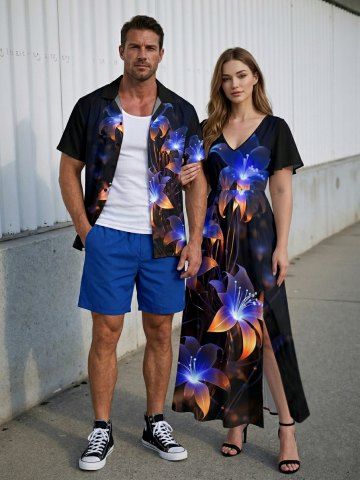 Tenues Hawaïennes Assorties> Ensemble de plage hawaïen assorti pour couples, imprimé 3D à fleurs pailletées, grandes tailles