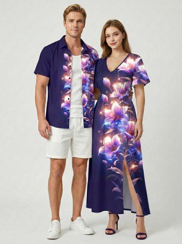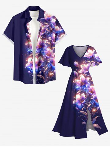 Tenues Hawaïennes Assorties> Ensemble de plage hawaïen assorti pour couples, imprimé 3D fleurs et paillettes, grandes tailles
