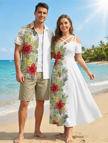 Tenues Hawaïennes Assorties > Ensemble de plage hawaïen assorti pour couples, imprimé feuilles tropicales et fleurs d'hibiscus, grandes tailles