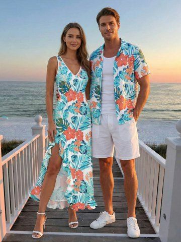 Tenues Hawaïennes Assorties> Ensemble de plage hawaïen assorti pour couples, imprimé feuilles tropicales et fleurs d'hibiscus, grandes tailles