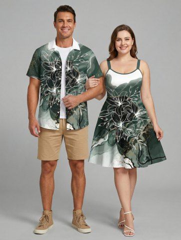 Tenues Hawaïennes Assorties> Ensemble de plage hawaïen assorti pour couples, imprimé fleurs et feuilles colorblock, éclaboussures de peinture, grandes tailles